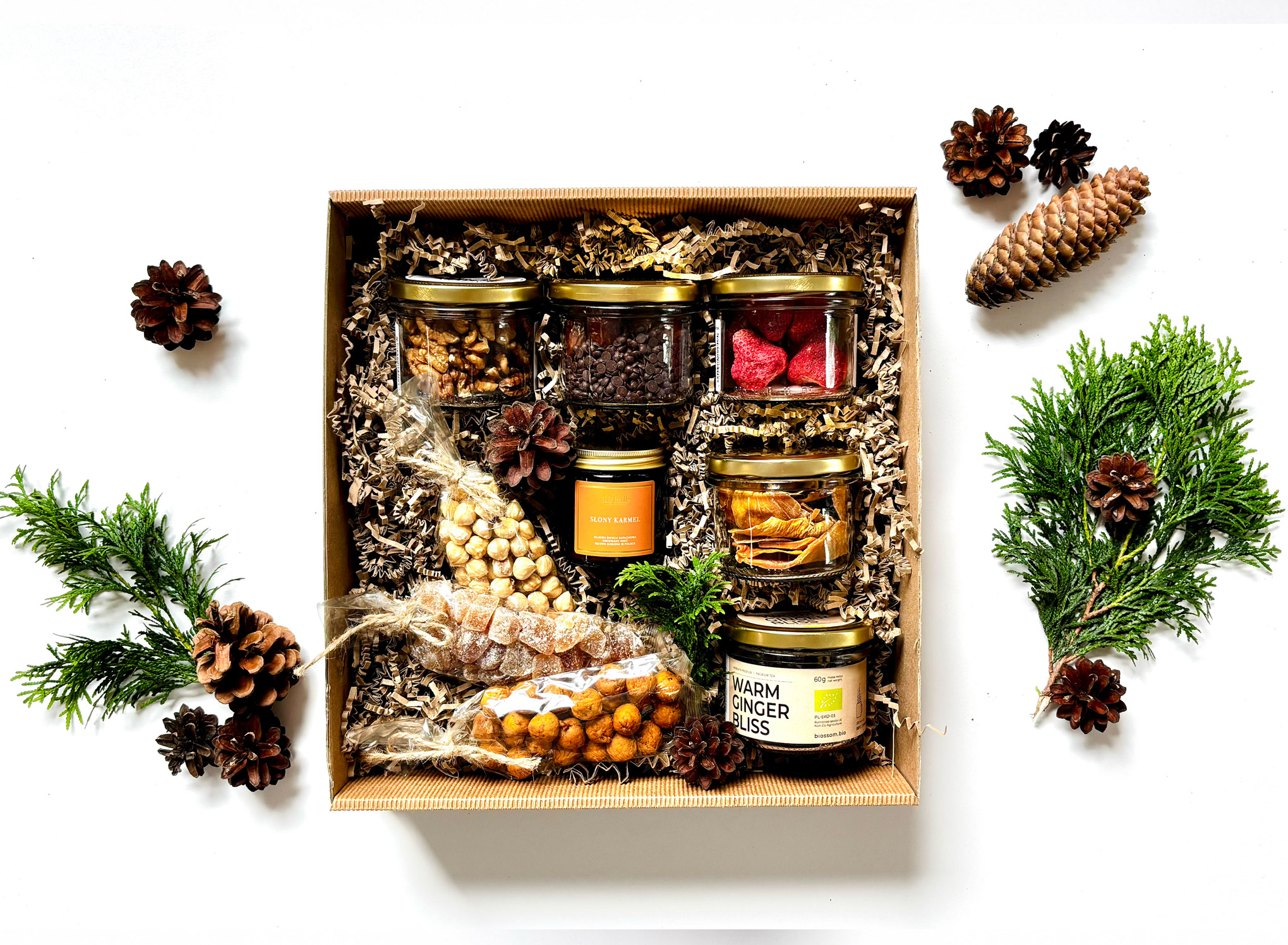 ZRÓWNOWAŻONY ROZWÓJ - zestawy zaprojektowane z myślą o zrównoważonym rozwoju zawierają produkty w ekologicznych szklanych słoikach lub kompostowalnych woreczkach, które na koniec zamienią się w biomasę. Całość pakujemy w drewniane skrzynki lub w karton FSC, wolny od nadruków, złoceń, plastiku czy kleju.